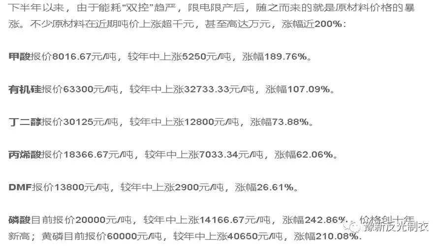 当限电遇上原材料涨价,工厂生产成本上升,企业经营面临较大压力,纷纷调整产品价格。无论是源头端煤炭的供不应求,还是生产线限产、开工率持续低位带来的低迷行情,对于企业而言都是致命的。成本激增之下,企业只能选择涨价的方式将压力转嫁至下游,进行“自救”。