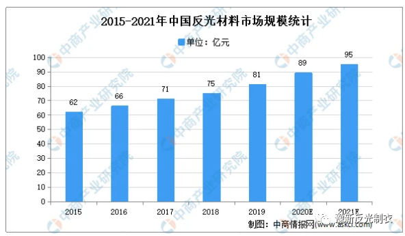 反光材料,广泛应用于交通标志标线、突起路标、轮廓标识、交通锥、防撞筒等各种道路交通安全设施,以及汽车号牌、衣物鞋帽、消防、铁路、水运、矿区等。随着经济的高速发展,下游行业发展旺盛,推动反光材料的发展。上海劳保技术展了解到,数据显示,2019年中国反光材料市场规模达81亿元。中商产业研究院预测,2021年我国反光材料市场规模将达95亿元。